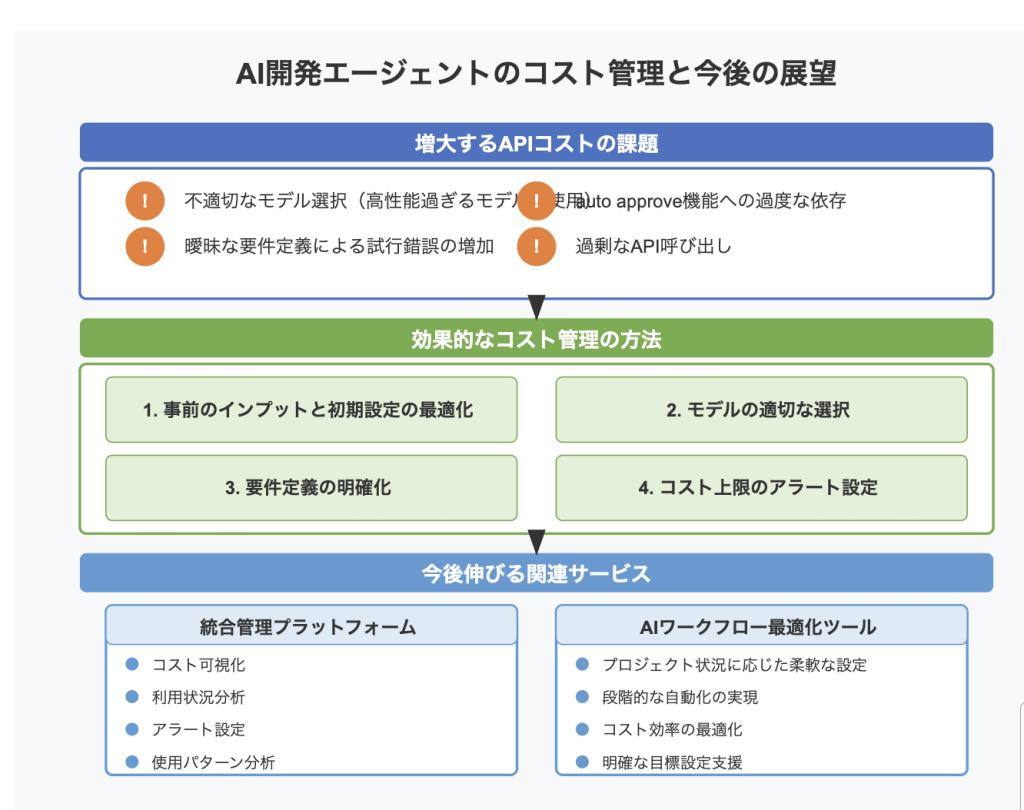 AI開発エージェントの効果的な運用には、初期設定の最適化と継続的なモニタリングが欠かせません。APIコストの増加を防ぐためには、プロジェクト開始前の準備や各段階でのコスト管理が非常に重要です。実際の事例からも、適切な要件定義や合理的なモデルの選択が、長期的に見たコスト効率の向上に寄与することが確認されています。