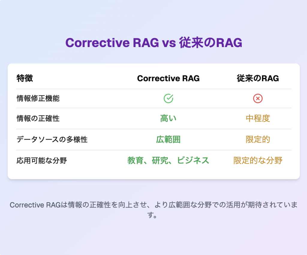 上記の比較に示されるように、Corrective RAGは特に「情報修正機能」と「情報の正確性」において大きな優位性を発揮しています。たとえば、NVIDIA AI技術に関する記事や最新のAIモデルによる応用と同様に、技術全体の精度を向上させるための工夫が随所に見られます。これにより、教育現場では理解度が高まり、ビジネス現場では迅速な意思決定が促進されるため、多方面での利用価値が高まっている状況です。