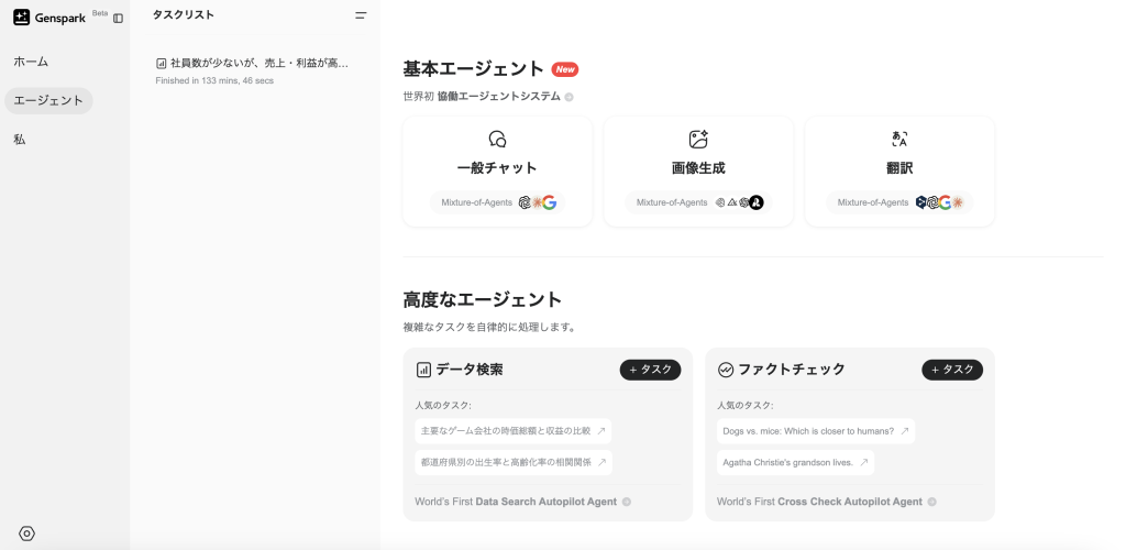 - 複数のAIエージェント: Gensparkは、各分野に特化した複数のAIエージェントが並行して動作し、質問内容に応じた最適な回答を導き出します。例えば技術系、マーケティング、経済など、細分化された専門知識を活用し、情報の多面的な取得が可能です。