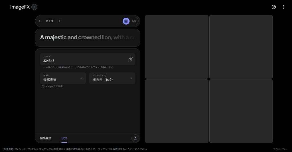 - 公式ガイドライン未整備:ImageFXに関する商用利用のガイドラインはまだ明確に記述されていないため、生成物の利用範囲については慎重な判断が必要です。