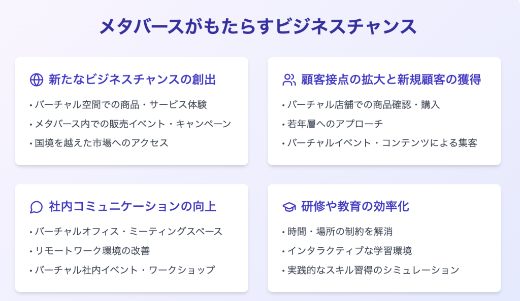メタバースは、新しいデジタル空間として企業に多様なビジネスチャンスを提供します。従来のオンラインビジネスやEコマースの枠を超え、企業は仮想空間でブランド体験を提供し、顧客接点を大幅に拡大することが可能です。たとえば、メタバース内でのバーチャルイベントや展示会は、物理的な制約を受けずにグローバルなオーディエンスにリーチできるため、売上向上やブランド認知度の向上に寄与します。