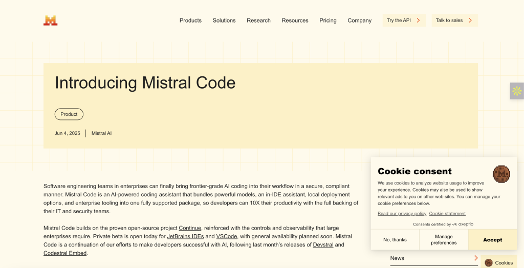 - Mistral AIが、GitHub Copilotの市場独占に対抗するエンタープライズ向けAIコーディング支援ツール「Mistral Code」を発表。