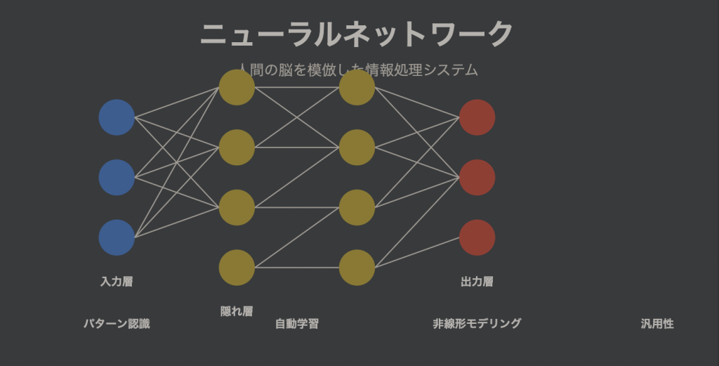 ニューラルネットワークは、人間の脳内の神経細胞(ニューロン)の動作を模倣して設計された情報処理システムです。この構造は、複雑なパターンや非線形な関係性を持つデータの認識・学習に非常に適しており、従来の統計手法では困難だった課題を解決するために開発されました。具体的には、膨大な量のデータから特徴量を自動的に抽出し、分類や予測を行うことができるため、画像認識、自然言語処理、音声認識などの多岐に渡る分野で採用されています。