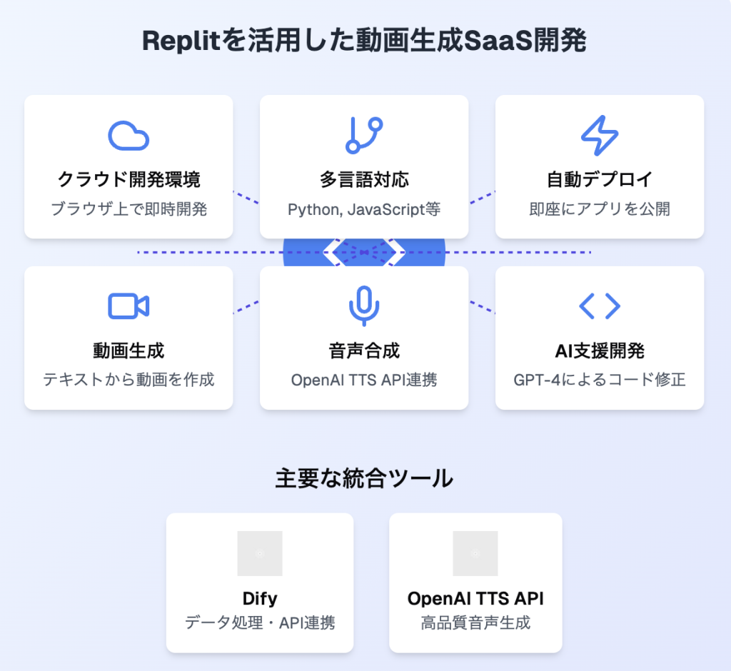 Replitを基盤とした動画生成SaaSの開発では、複数の先進的技術を組み合わせることで、効率的かつ柔軟な処理が実現されています。ここでは、具体的な開発手法やシステム連携の詳細について解説します。これによって、各工程での技術的裏付けや運用の工夫についても理解できます。